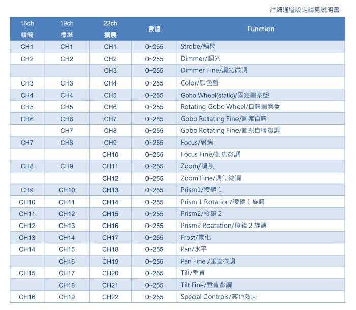 DMX512 :16/19/22 Channel