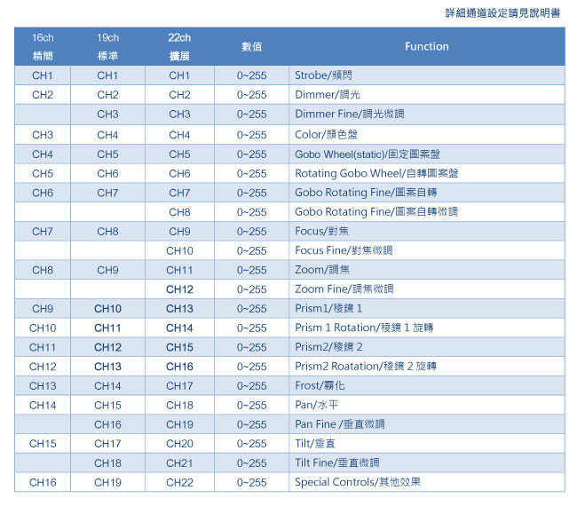 DMX512 :16/19/22 Channel