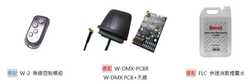 控制: 手動控制/DMX/定時控制/無線控制(選配)/無線DMX(選配)