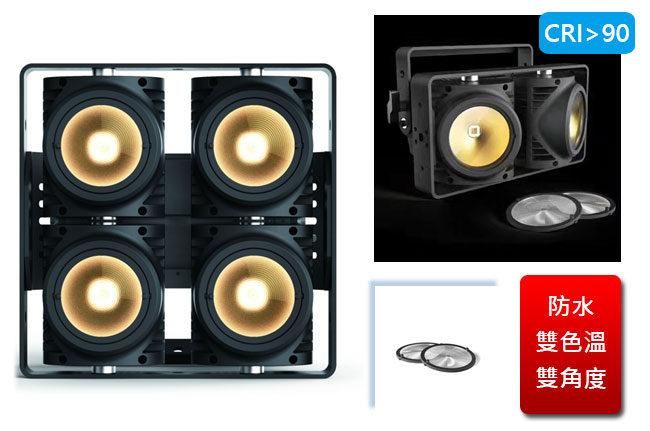 採用 4 顆 100W 雙色溫 LED 為光源(四燈),出光光束角度 15/60 度