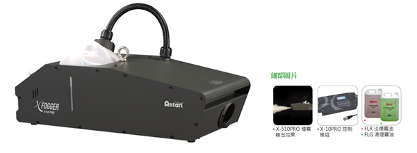 • X-510PRO ( 1000W ) 及 X-515PRO ( 1500W ) 煙霧機型,是 X-PRO 系列的主力機型,同時也是專業市場中的高階產品,其流線的外型,涵蓋著百分之百的純鋁鑄電熱管,而幫浦在運轉時非常安靜,整體電路設計,具有高效保護裝置,常有效率,能夠完全融入專業的演出