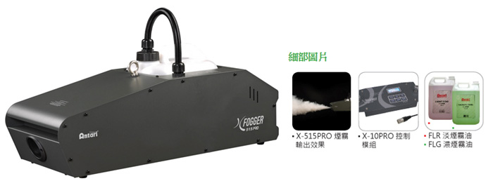 • X-510PRO ( 1000W ) 及 X-515PRO ( 1500W ) 煙霧機型,是 X-PRO 系列的主力機型,同時也是專業市場中的高階產品,其流線的外型,涵蓋著百分之百的純鋁鑄電熱管,而幫浦在運轉時非常安靜,整體電路設計,具有高效保護裝置,常有效率,能夠完全融入專業的演出